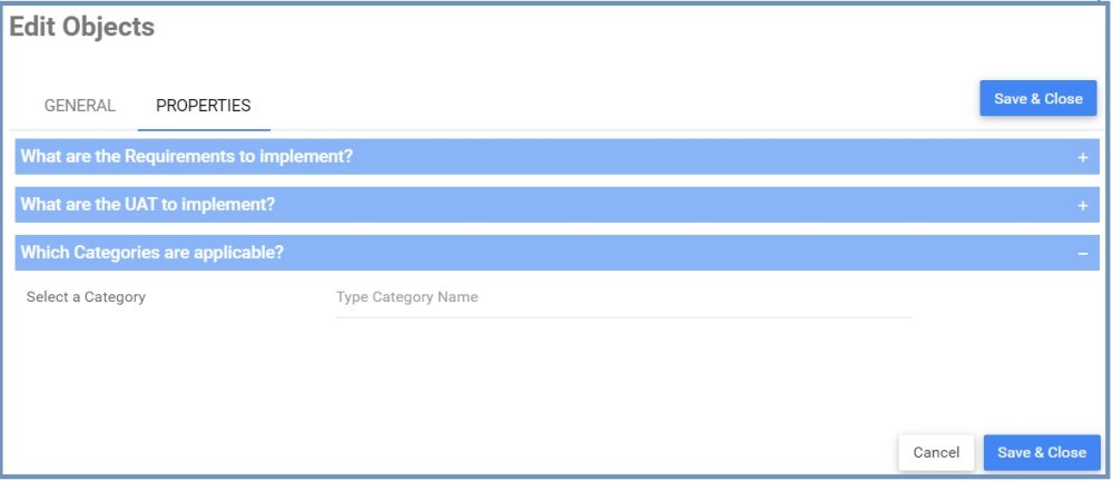 The Mass edit-Categories selection feature will allow the user to select the categories that are applicable to one or more objects through a single interaction.