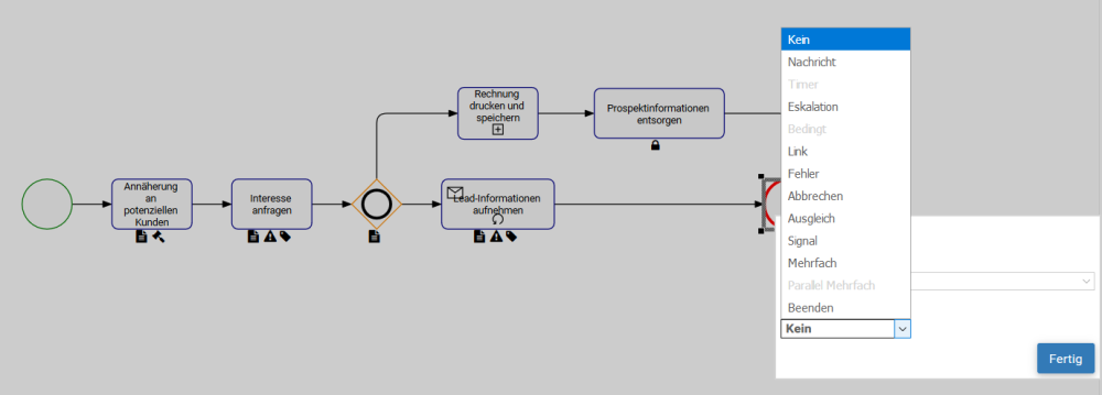 - Es wird ein Popup-Fenster generiert, in dem Sie die BPMN-Eigenschaften für das Ereignis auswählen können.