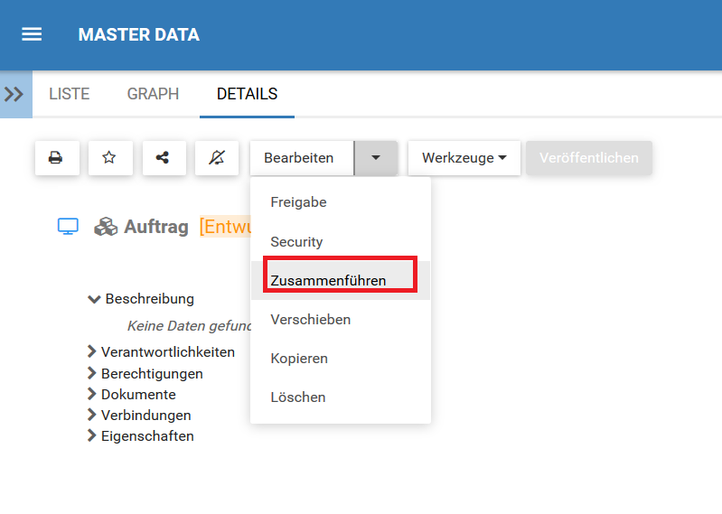 Benutzer finden diese Funktion auf der Detailseite der Elemente. Weitere Anweisungen zur Verwendung unserer *Merge*-Funktion finden Sie in der Arbeitsanweisung hier.