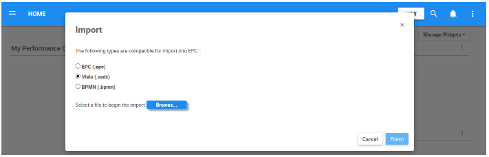 3. Navigate to the box, go to your “Downloads” folder, and select the file “Visio Process – EPC 11 Tutorial”. Check the “Publish” box, allowing the objects to be published upon import. Click on the button to complete the import.