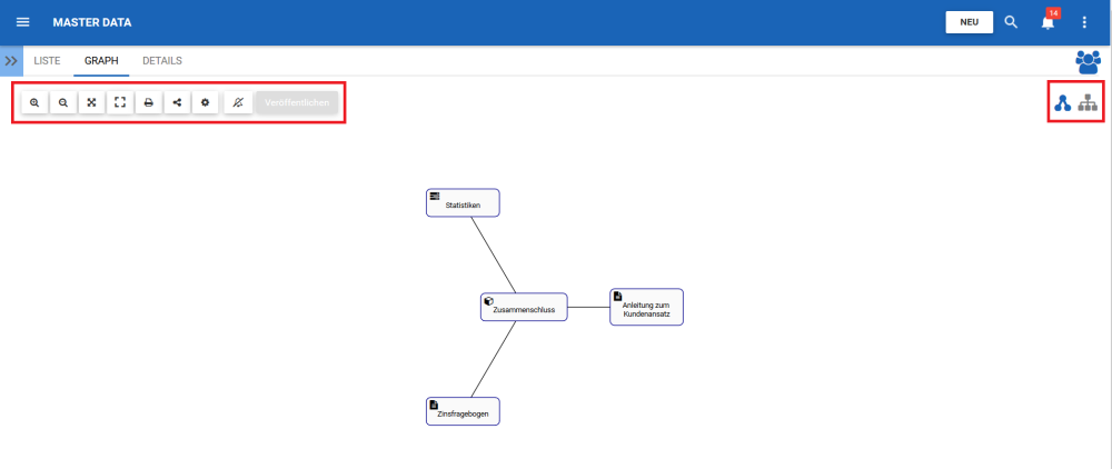 Die Navigation innerhalb des Diagrammabschnitts wird primär über die Symbolleiste oben auf der Seite gesteuert. Die Symbolleiste ist in 2 Abschnitte unterteilt.