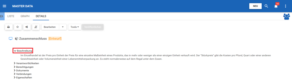 Der Abschnitt Beschreibung enthält alle Details darüber, was ein Entity oder Attribut ist, sowie bestimmte Informationen, die bei der Ausführung helfen können. Diese Informationen, die von EPC-Modellierern ausgefüllt werden, bieten weitere Informationen für Benutzer.