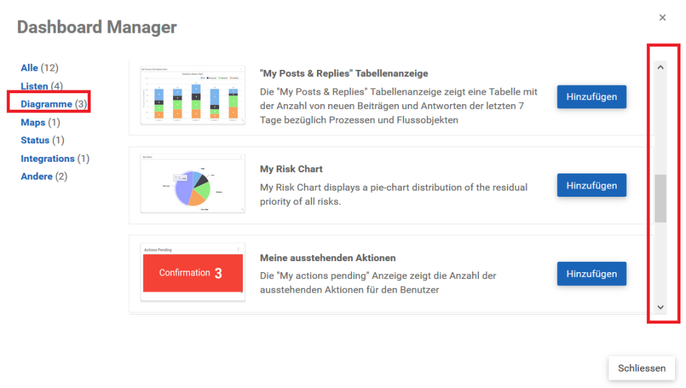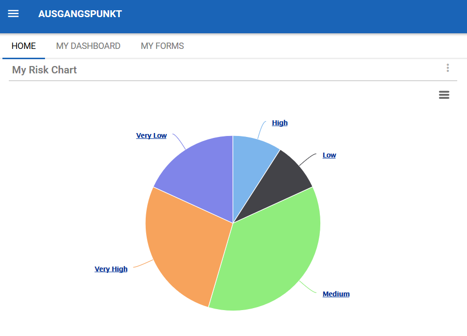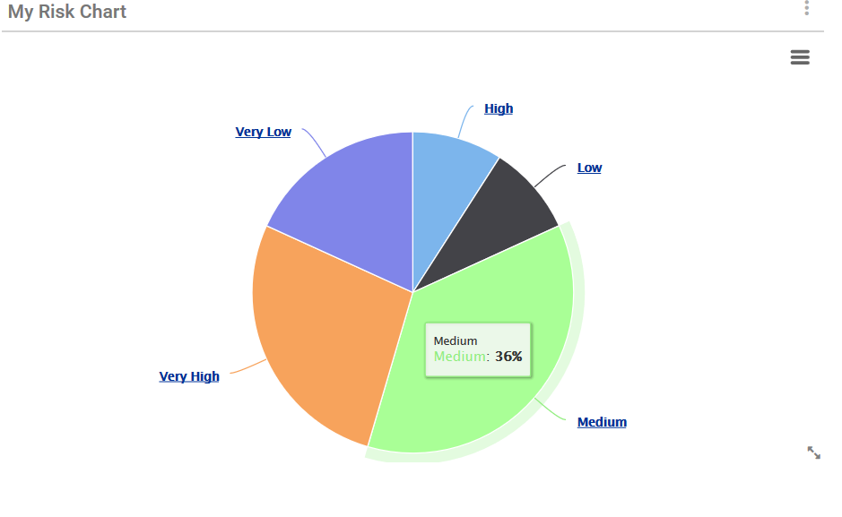 Das Widget My Risk Chart bietet einen großen Mehrwert, wenn Benutzer verantwortlich sind oder an risikoreiche Aufgaben und Prozesse gebunden sind. Durch das Hinzufügen des Widgets My Risk Chart zu ihrem Dashboard haben Benutzer Zugriff auf eine Tortendistribution. Es zeigt die Restpriorität aller Risiken nach Kategorien an. Jede Kategorie kann angeklickt werden, um auf spezifischere Details zuzugreifen.