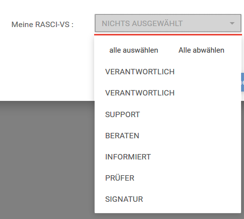 8. Mein RASCI-VS kann erst ausgewählt werden, wenn mindestens eine Rolle für die Option “Mir zugeordnet als” ausgewählt wurde. Es ermöglicht Ihnen, die Informationen zu einer bestimmten Verantwortung, die Ihnen übertragen wurde, oder zu mehreren Verantwortlichkeiten anzuzeigen.