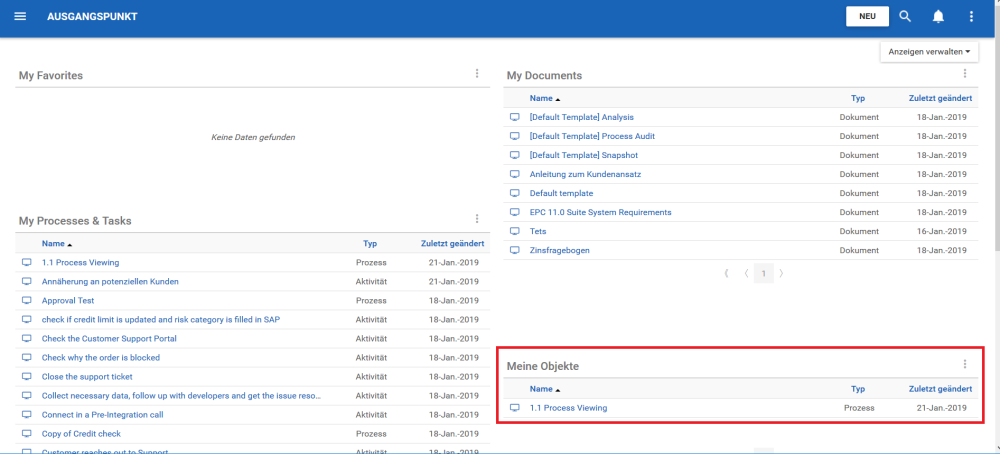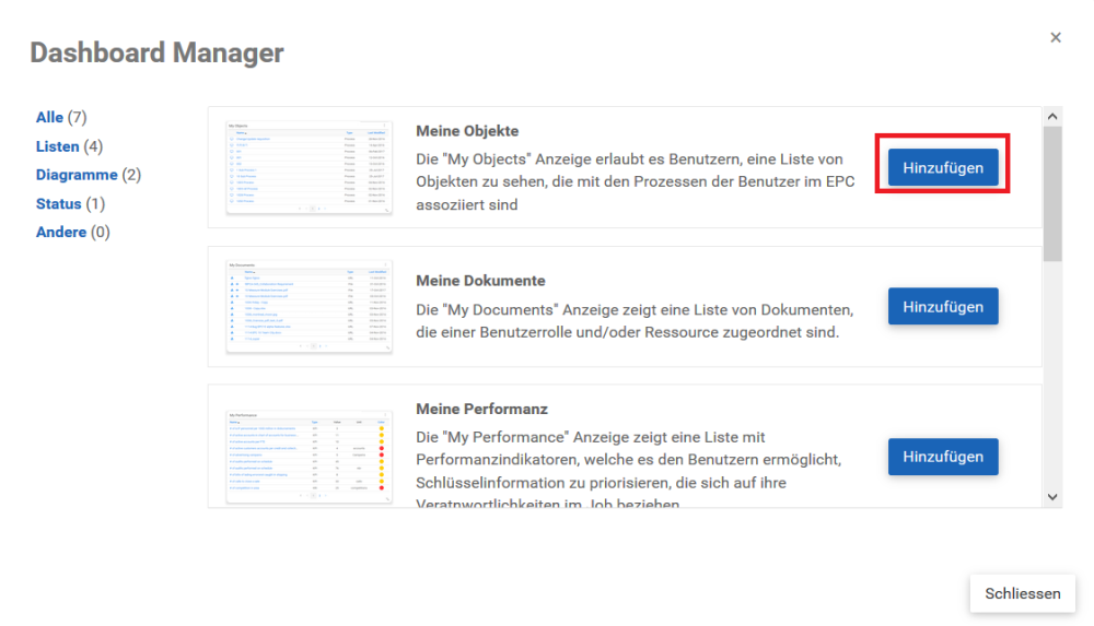 4. Wählen Sie das Widget, das Sie zu Ihrer Homepage hinzufügen möchten, z.B. klicken Sie in diesem Beispiel auf das Feld , um “Meine Objekte” zu Ihrer Homepage hinzuzufügen.