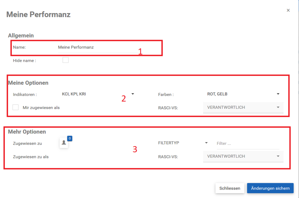 | Meine Optionen | Meine Optionen | Persönliche Leistungsmessung Assoziationsfilter. Ermöglicht es den Benutzern, durch Leistungskennzahlen zu filtern, dass sie auch persönlich verwandt sind, direkt oder indirekt. |