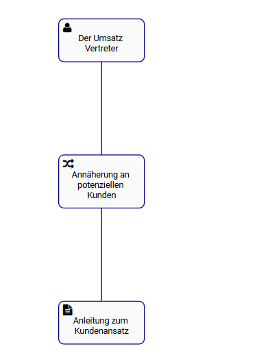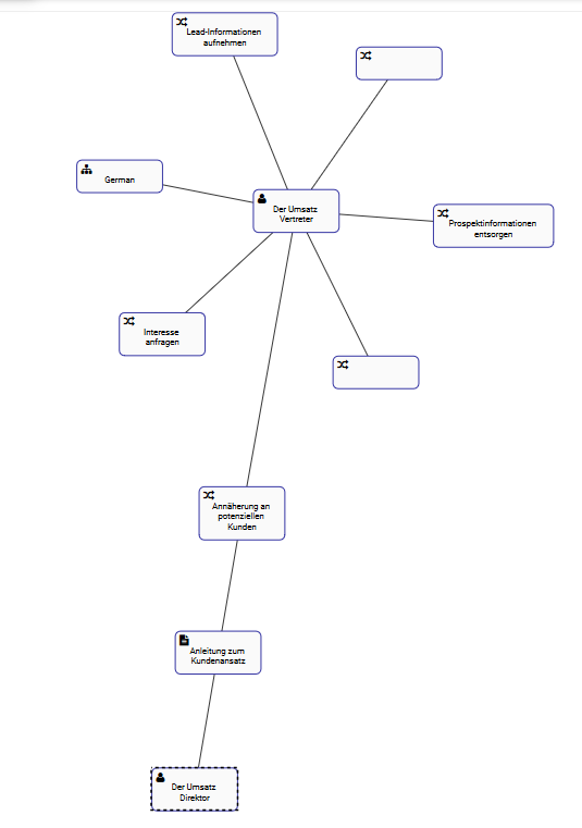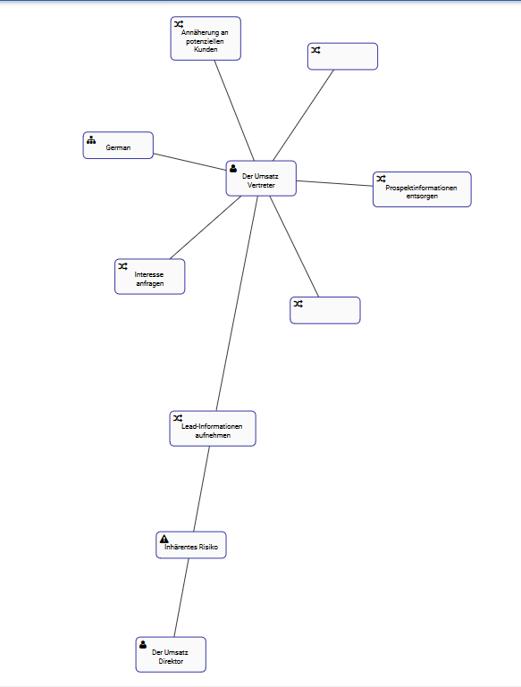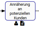 Das Beispiel zeigt das Wirkungsdiagramm der Aufgabe “Kundeninformationen erhalten”. Der Aufgabe selbst ist ein Dokument (Customer Approach Guide), eine Rolle (Sales Manager) und eine Anlage (CRM-System) zugeordnet. Die Besonderheit der zugehörigen Elemente wird durch das Symbol neben dem Namen der Elemente angezeigt.
