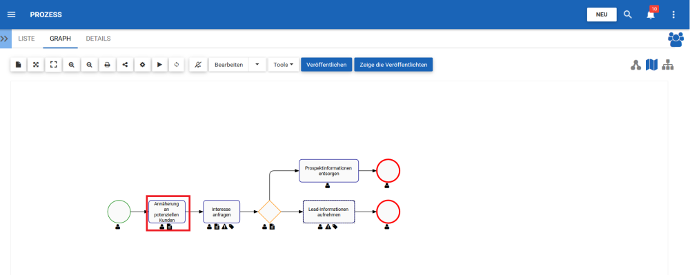 2. Standardmäßig wird ein Benutzer zum Diagramm Processes Map navigiert. Um die Wirkungsgrafik eines bestimmten Elements anzuzeigen, muss ein Benutzer das Element auswählen, bevor er zur Wirkungsgrafikansicht navigieren kann. Für dieses Beispiel wählen wir die Aufgabe “Kundeninformationen erhalten”, indem wir auf den Punkt klicken.