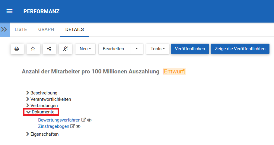 Den Benutzern wird ein Direktzugriffslink zur Verfügung gestellt, der in blau aufgeführt ist. Ein Klick auf den Namen führt einen Benutzer zur Seite mit den Dokumentdetails.