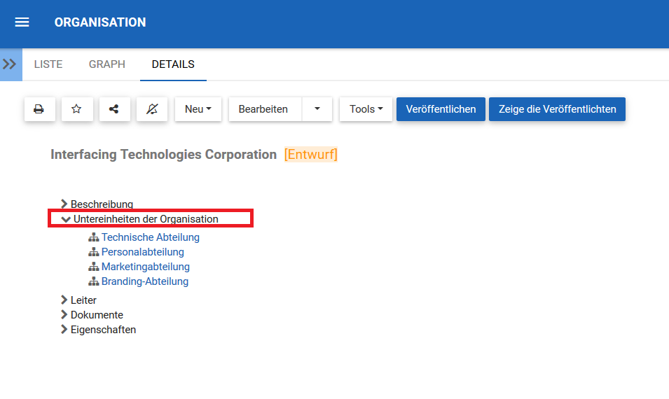 Im Abschnitt Organisationsuntereinheiten werden alle Unterkomponenten einer bestimmten Organisationseinheit angezeigt. Es stellt eine textuelle Hierarchie von Einheiten und den zugehörigen Untereinheiten zur Verfügung.