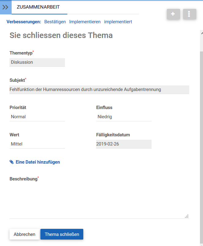 Von hier aus kann ein Benutzer in einem nachfolgenden Fenster die Beendigung des Engagements überprüfen und bestätigen. Die Benutzer sind verpflichtet, nach Beendigung einer Zusammenarbeit eine Beschreibung vorzulegen.