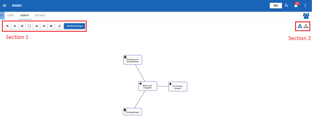 Die Navigation innerhalb des Diagrammabschnitts wird primär über die Symbolleiste oben auf der Seite gesteuert. Die Symbolleiste ist in 2 Abschnitte unterteilt.