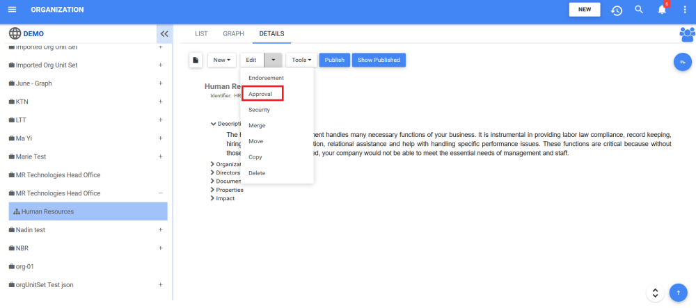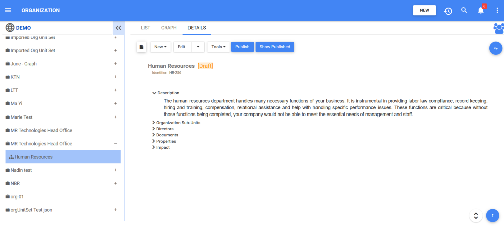 - Navigate to the details section of the object. In this example, an Organization Unit