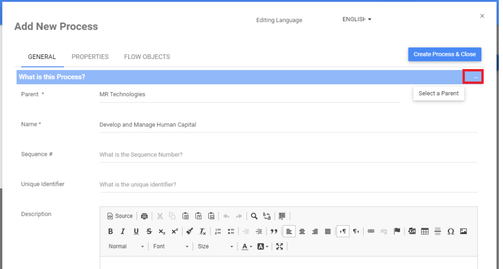 8. Use the and icons to expand and hide the different sections within the each tab of the New Process Window. Input the right information about the process in each section.