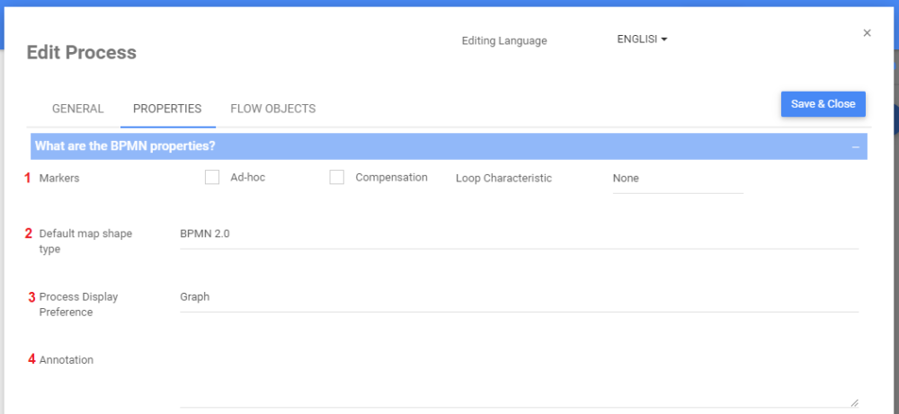 Annotations serve as textual support on the process map. Each Process and Flow Object can have one annotation, which will display the text input in this field on the map attached to the relevant shape as show below.