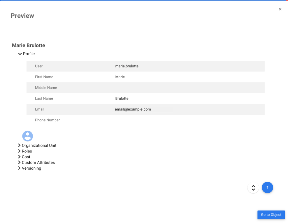 Users can click on the object’s name to view its details in a popup. For this exemple, we opened the preview for the Resource.