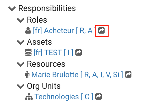 The Responsibilities section displays de roles, resources, org units and/or assets that are responsible for the capability you are viewing. This provides additional details about any associated object that has been tied to the item using the RASCI-VS matrix.