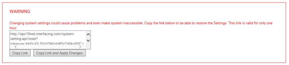 3. La première boîte affichée est un avertissement pour l’administrateur système lui indiquant à présent comment la modification des paramètres système pourrait causer des problèmes et même rendre le système inaccessible. Un lien pour restaurer les paramètres est donné valide pendant une heure.