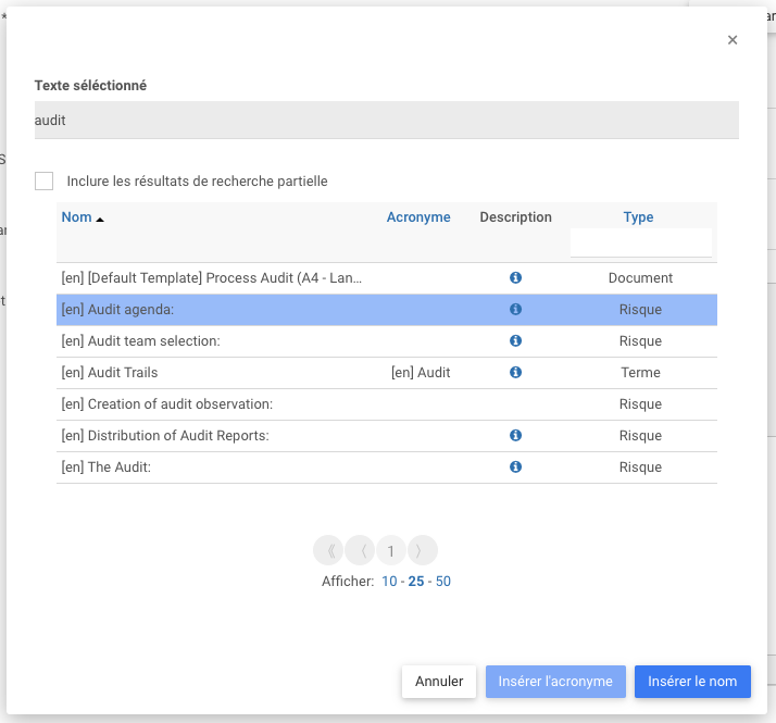 6. Sélectionnez l’objet souhaité. Pour enregistrer, cliquez sur Insérer un acronyme ou Insérer un nom