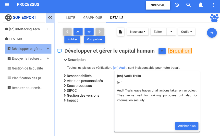 1. Accéder à l’onglet Général de Détails de l’objet souhaité. Dans cet exemple, un processus appelé Développer et gérer le capital humain.