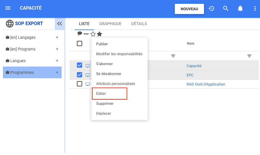 1. Accédez à la vue Liste d’un module de capacité.
