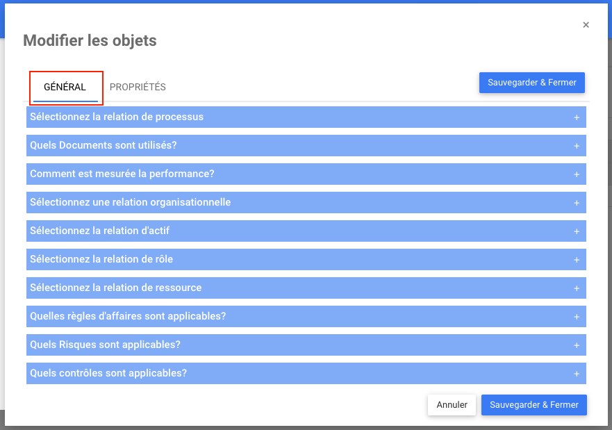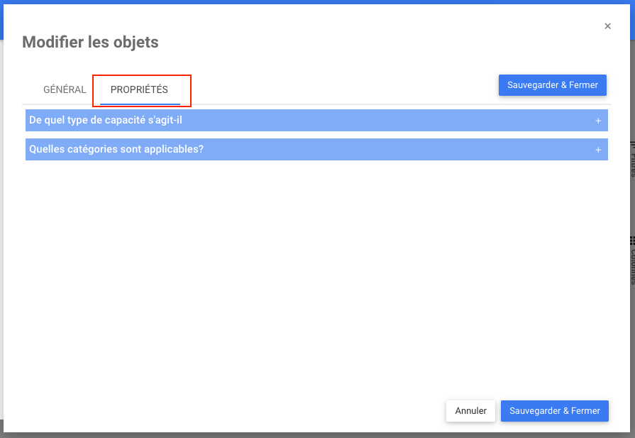 La fonctionnalité d’édition de masse permet à l’utilisateur de sélectionner les propriétés générales et applicables à un ou plusieurs objets via une seule interaction.