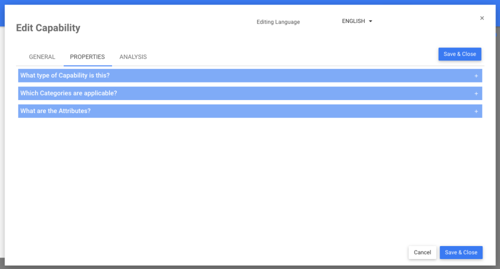 The Properties tab contains sections for the type, the categories applicable and the attributes.