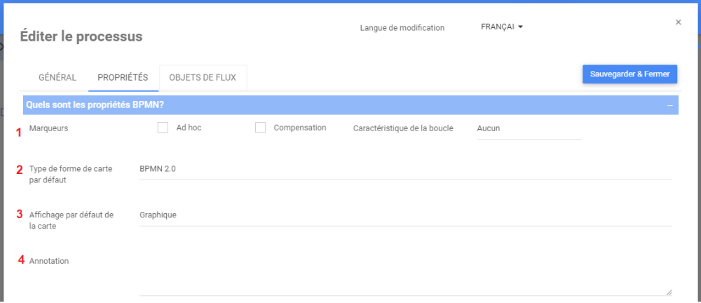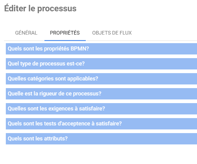 L’onglet Propriétés de Processses contient des sections pour les propriétés BPMN, le type, les catégories applicables et les attributs.