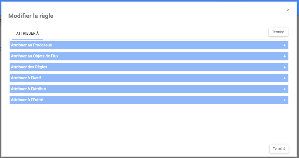 Les modélisateurs Web peuvent assigner des objets de règles sur l’application Web à d’autres objets EPC directement à partir d’une page de détails de règles. Il s’agit des objets suivants auxquels une règle peut être assignée : Process, Flow Object, Rules, Asset, Attribute & Entity.