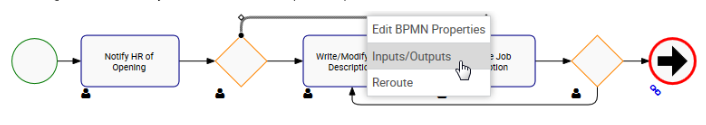 Now that your BPMN objects are linked together, you need to add Inputs and Outputs. Inputs and Outputs define the flow of work between the shapes within a process. They represent the inputs required to start an activity and the outputs produced once the activity is completed.