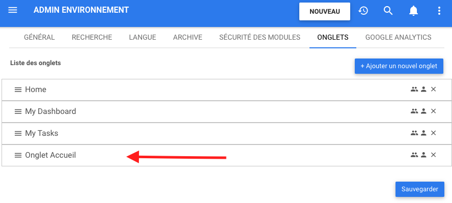 Ces fonctions sont disponibles pour les administrateurs système et d’environnement. Il existe trois onglets par défaut pour tous les nouveaux environnements tels que « Accueil », « Mon tableau de bord » et « Mes tâches ». Celles-ci peuvent être supprimées ou adaptées au goût de tout individu.