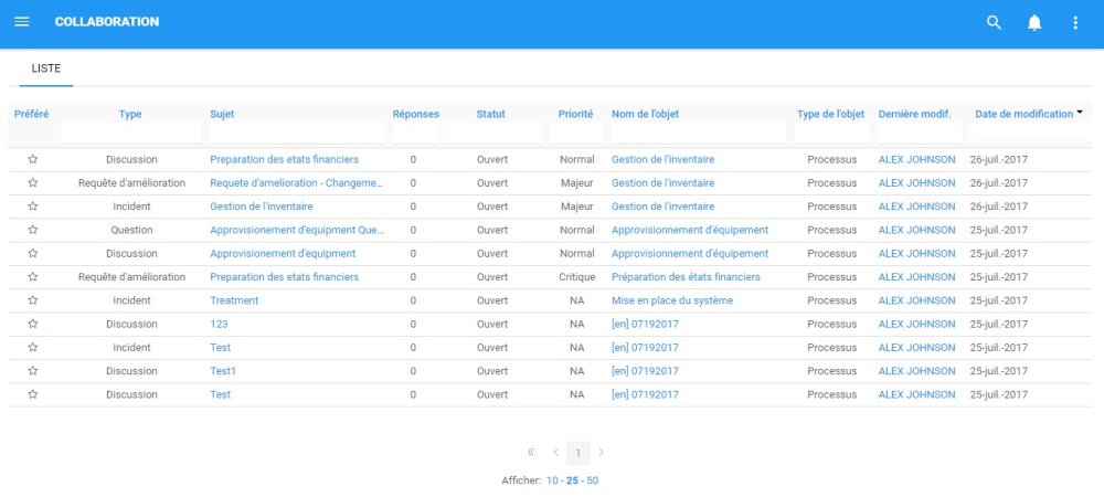 Le module Collaboration fournit un format répertorié de tous les objets avec lesquels un utilisateur est engagé. L’engagement peut signifier qu’ils discutent actuellement, interrogent ou rapportent des informations sur un item, mais ça implique également des items auxquels les utilisateurs sont liés (se servant de la matrice RASCI-VS) qui subissent actuellement de telles améliorations. Le module de collaboration comprend un format de liste, avec une variété d’informations clés qui sont entrées par les utilisateurs lors de l’engagement d’activités de collaboration. Ces caractéristiques principales sont mises en évidence ci-dessous: