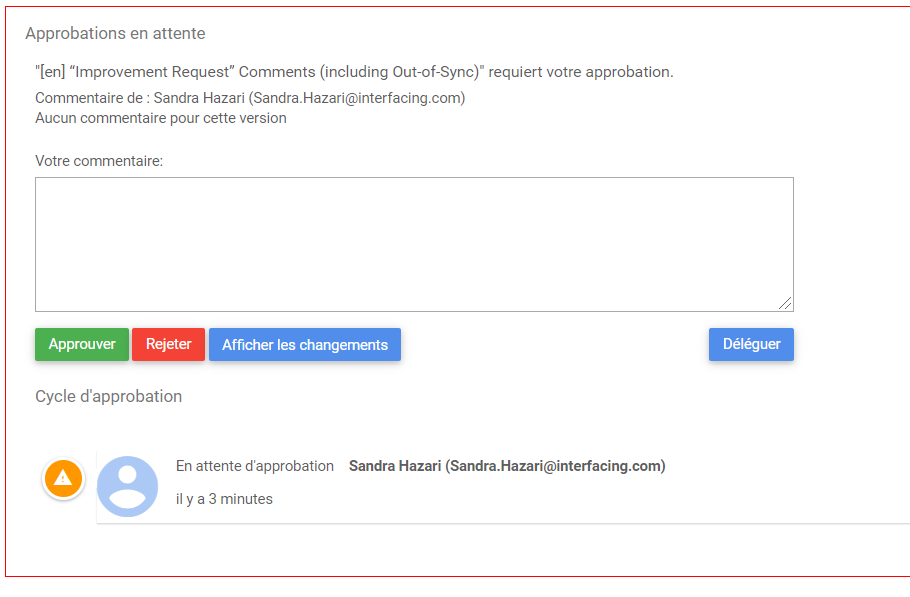 Un objet peut passer par plusieurs cycles d’approbation avant d’être publié. Par exemple, dans un cycle d’approbation en série, le deuxième approbateur pourrait avoir remarqué une erreur que le premier approbateur n’a pas repérée et rejettera les modifications. Alternativement, un objet peut avoir passé un cycle d’approbation, mais avoir subi des modifications avant sa publication, déclenchant un autre cycle d’approbation. Dans ces deux scénarios, l’approbateur peut ne pas se souvenir de ce qu’il a approuvé s’il y a plusieurs cycles entre le changement approuvé / rejeté et la publication.