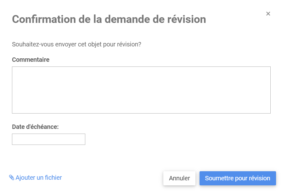 - L’utilisateur peut envoyer un objet pour révision sans ajouter de commentaire, de date d’échéance ou en joignant un document.