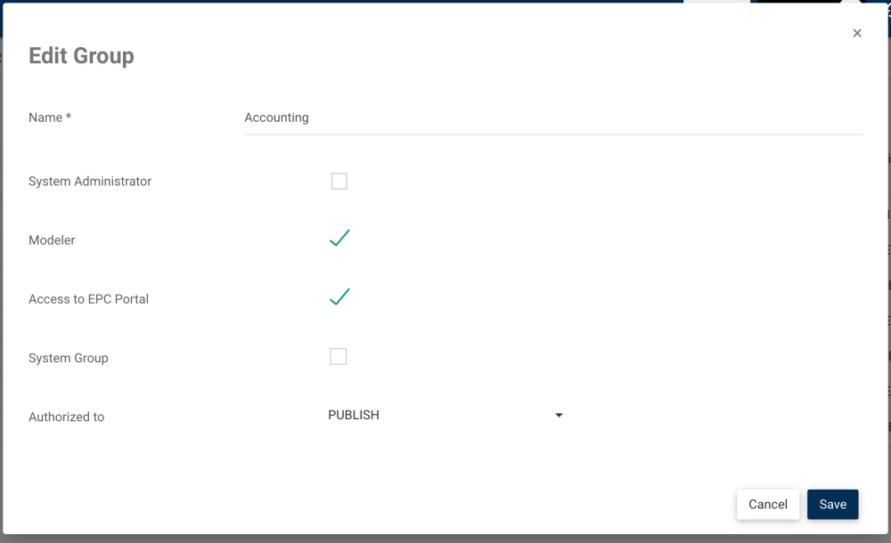 - 3 The authorizations of the group can also be edited from the “Authorized to” drop-down. The possibilities are Publish, Merge, Import or Export. If the user only has the “Access to EPC Portal” checked, they can never be granted any of these authorizations. Publish and merge can be granted or denied to modelers. Import and export can be granted of denied to environment admins. System admins cannot be denied any of these authorizations. If you do grant them only the publish option for example, then they will be denied the other possibilities.