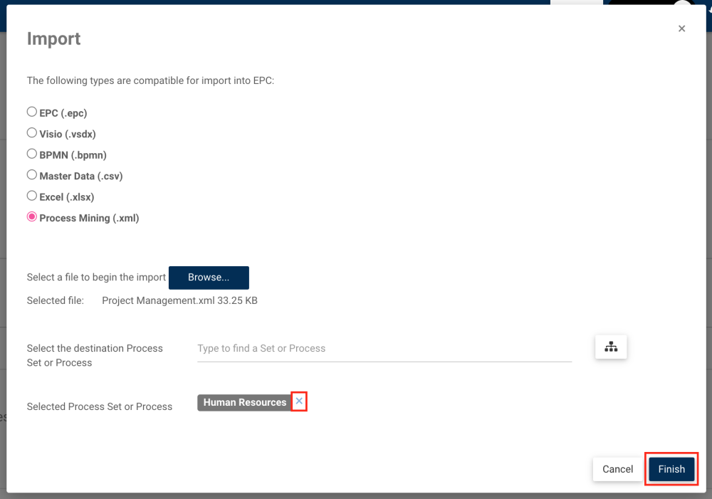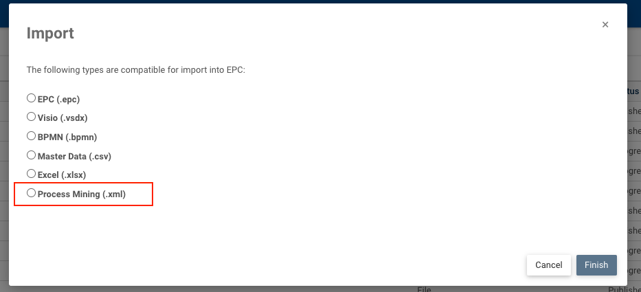 2. In the import window, select Process Mining (.xml) for Fluxicon files.
