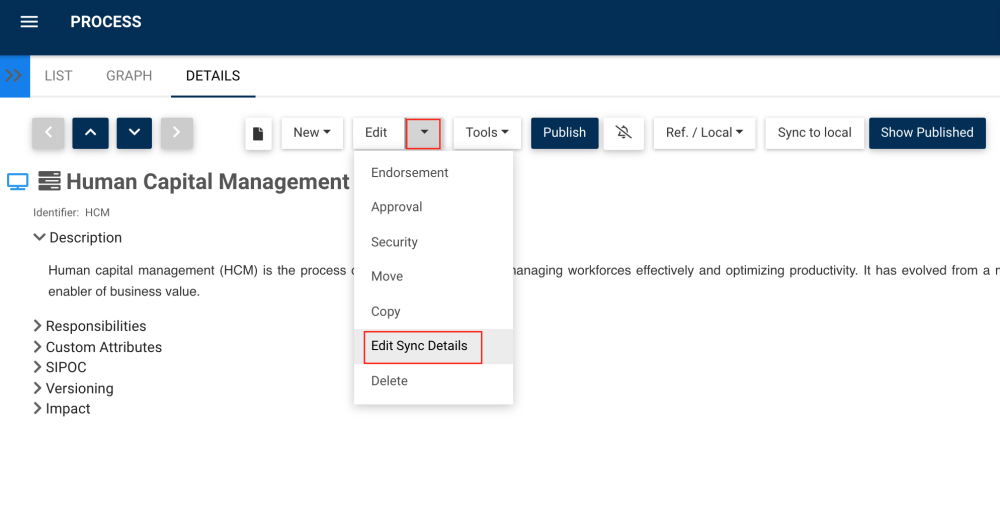 2. Navigate to the Source process or flow object’s Details or Graph page. Click on the Edit menu and select “Edit Sync Details”.