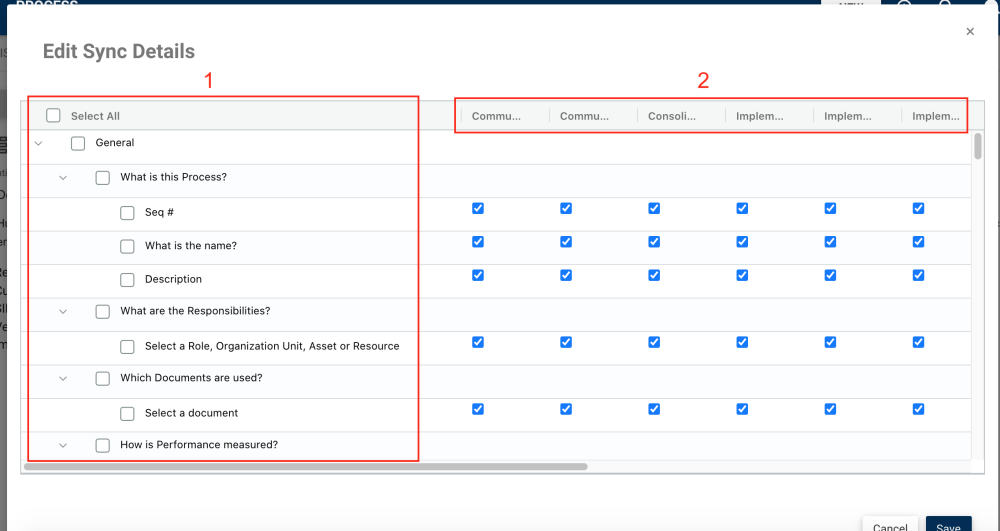 • (1) At the left, users will see the multi select checkboxes that they can use to select or deselect all object form sections, fields or attribute.