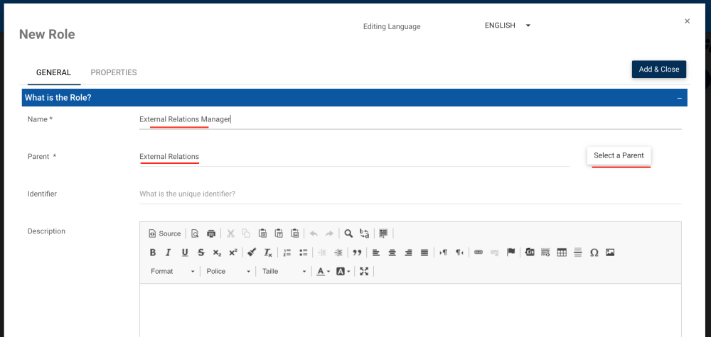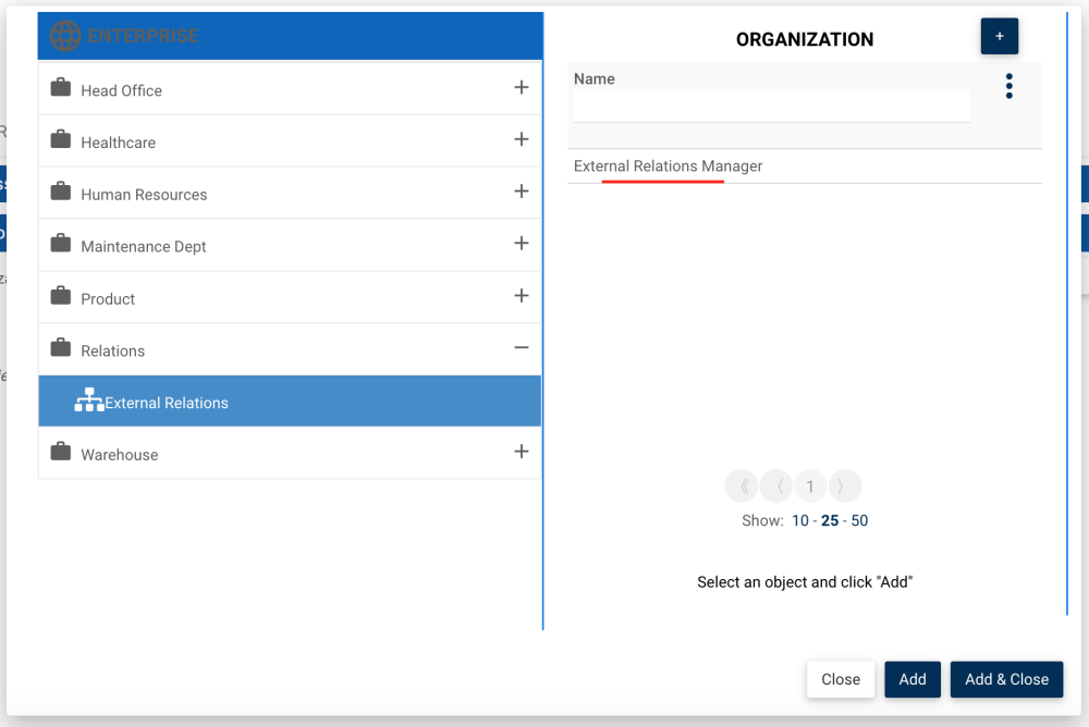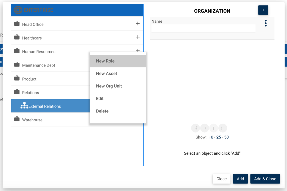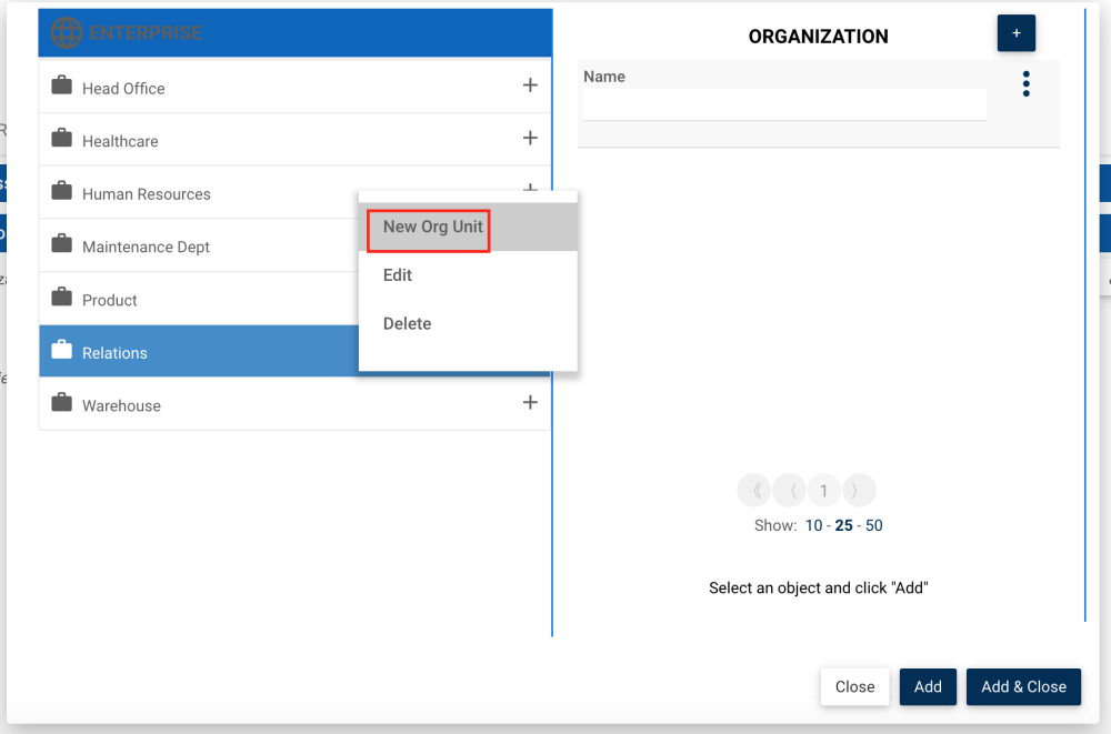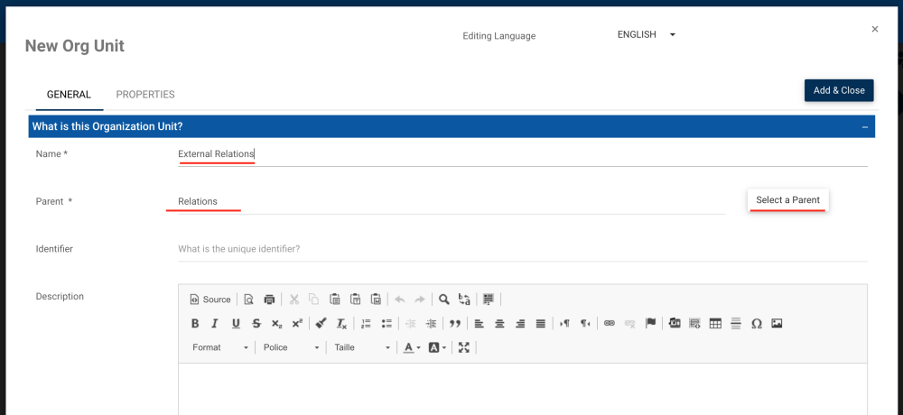 - The same way you did for the set, you can enter the following information about the “New Org Unit” and click on the Add & Close button:
