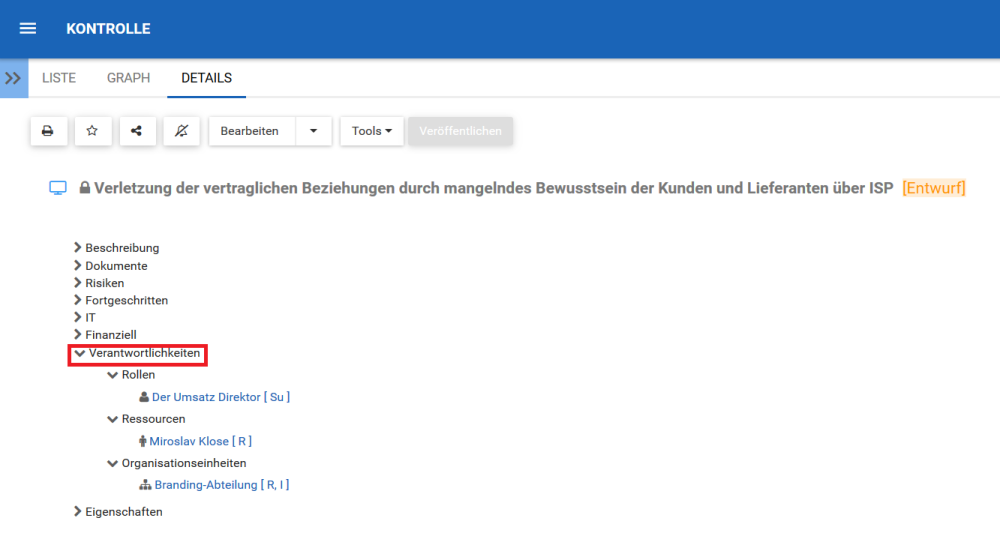 Im Abschnitt Verantwortlichkeiten werden die Rollen, Ressourcen und/oder Vermögenswerte angezeigt, die für das von Ihnen angezeigte Control verantwortlich sind. Dies liefert zusätzliche Details zu jedem zugehörigen Objekt, das über die RASCI-VS-Matrix mit dem Element verknüpft wurde.