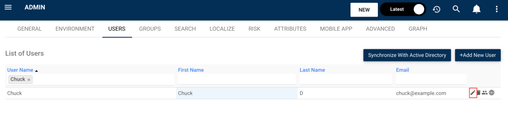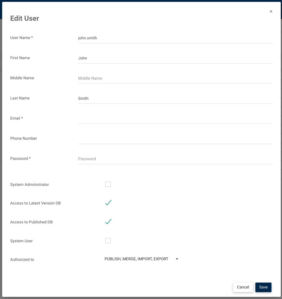 When needed, administrators can edit user information. System Admins can perform in-line edits for information displayed in the user list, or can navigate to the edit section for further editing capabilities. In the edit section, admins can grant or deny users, modelers or admins the right to publish, merge, import or export objects.