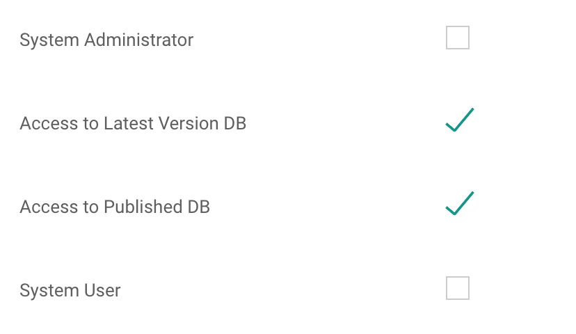 4. Check the boxes for the level of access you desire to edit. System Admins can grant them System Admin, Latest Version DB (they will see all objects), Published DB (they will see only published objects) or System User access.