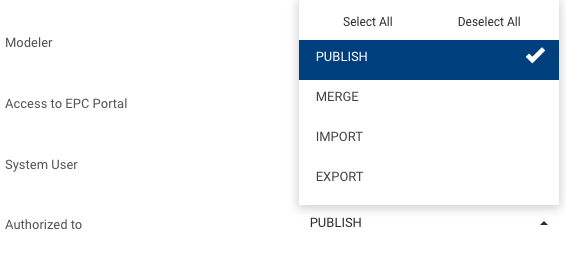 5. In the last drop-down, select the authorizations to grant the user. The possibilities are Publish, Merge, Import or Export. If you do grant them only the publish option for example, then they will be denied the other possibilities.