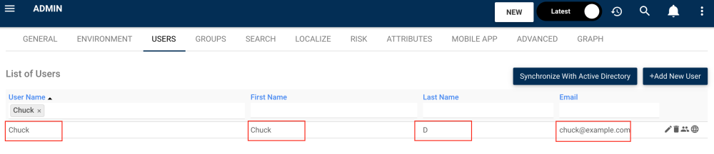 In line edits can be performed by selecting item (User Name, First Name, Last Name or Email) directly within the user list. Simply click on the desired section (below has User Name selected) and type in the desired edit for the user profile.
