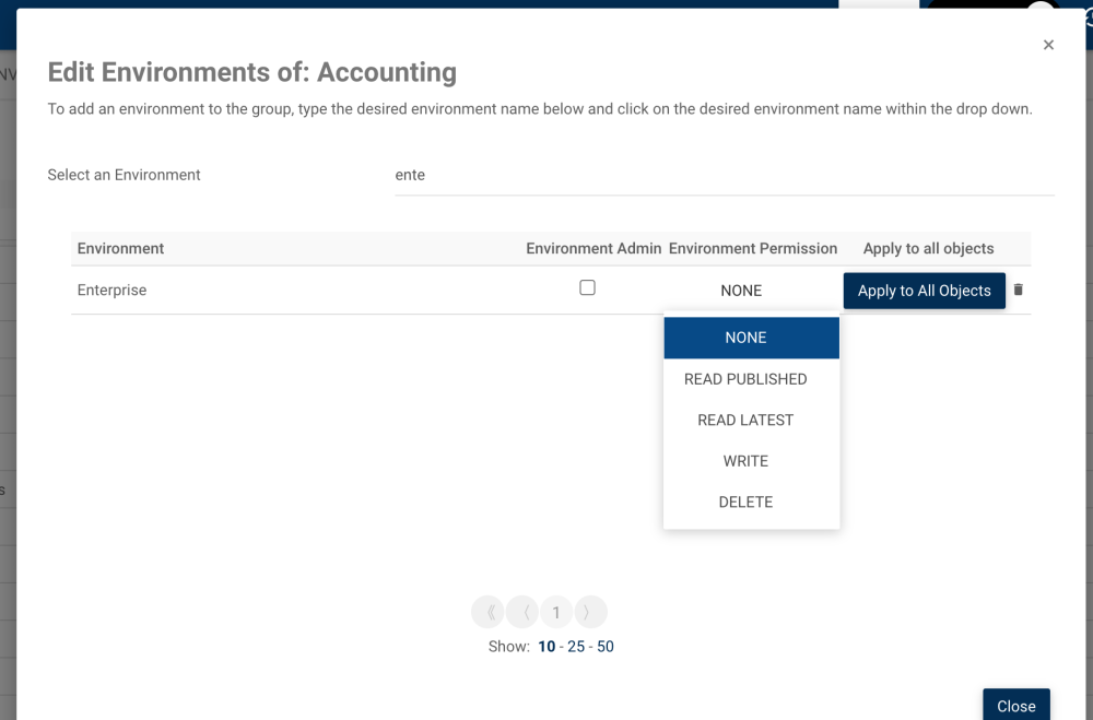 Different levels of security can be assigned to Environments when added to a Group in the System Admin section:
