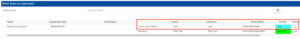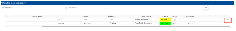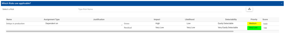 The Risks will appear in a table displaying the items name, type, impact, likelihood, detectability, priority, score and % of gross. Modelers have the ability to edit the gross and residual risk analysis without the edit affecting the risk itself. This ensures that organization’s gross risks are more accurate per object, as one risk can impact distinct business elements differently.