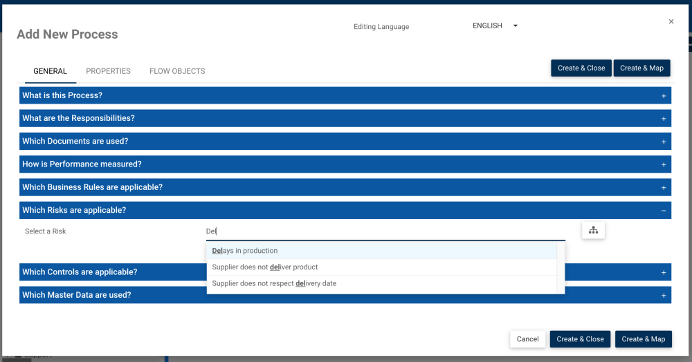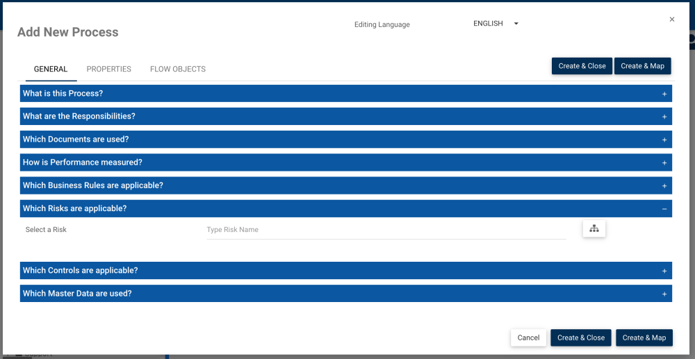 This section is available within the edit form of Processes or Flow Objects (Tasks, Events, and Gateways), Rules, Performance Indicators, and Risks (as Child Risks).