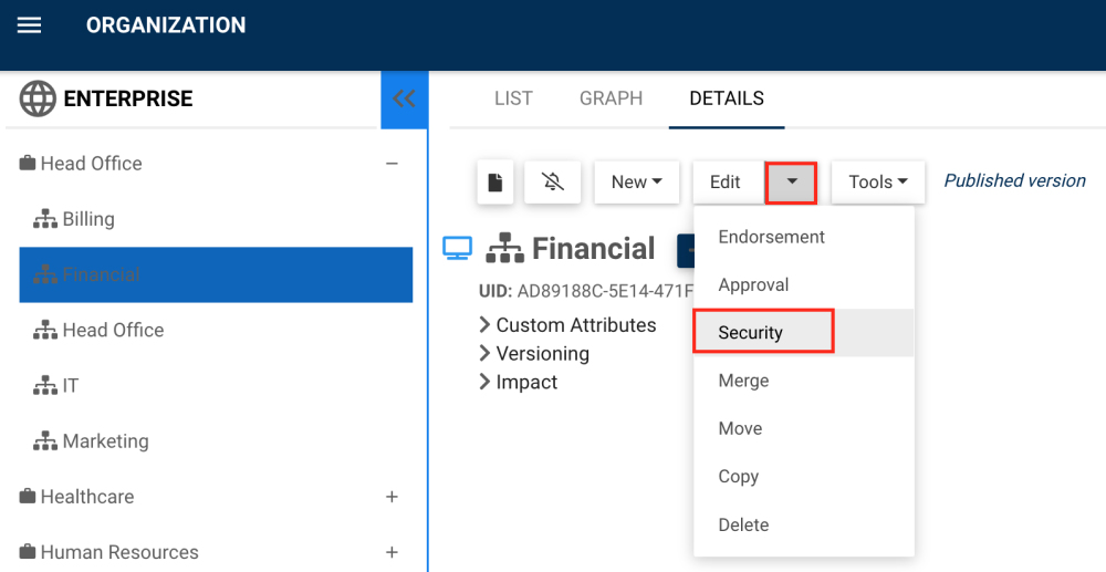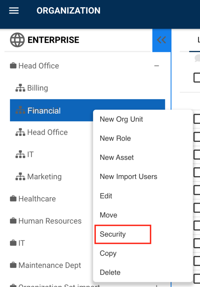 1. Navigate to the desired object in the hierarchy tree and right-click. Select the “Security” button. The security button can also be accessed in the Details page, under the “Edit” menu