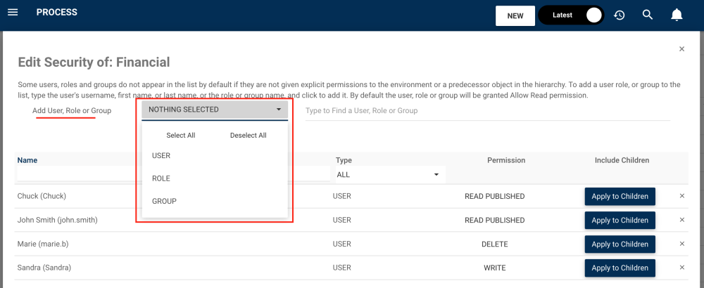 3. To add a user, role or group to the list, users can navigate to “Add User, Role or Group” and select a filter if desired.