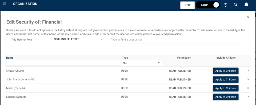 Users can define the security of groups or users by assigning them permissions on environments, sets, folders and objects, all independently or including their children objects, by clicking on the “Apply to children” or “Apply to all objects” box. If this box was not clicked before saving, the permission will not be inherited by children objects. The settings on children objects can be modified without affecting the settings of its parents.